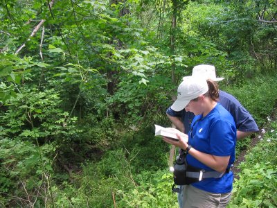 ![]() We brought Jennifer along, the one with the field research training. On the first short stretch, the terrain was tolerably level, with lots of flora. Jenn is looking up just what we're looking at. Despite the easy terrain, I managed to (slightly) fall over into the brush on the return trip. |