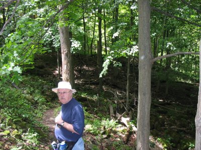 ![]() Dave only looks startled because the camera is pointed at him! You can see the trail heading out of his right pocket. These are NOT groomed trails. The Bruce Trail Association makes sure that major deadfall is removed and occassional aids to passage (like stairs and simple bridges), but that doesn't make it easier. |