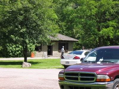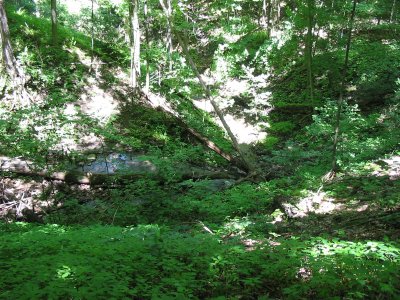 ![]() This shows a notable feature. For about 150 feet huge chunks of rock simply cleft away from the escarpment face. The one in the shot is about the size of my living room. This is not typical for the area except where the face has been undercut by water. It wasn't. Earthquake (we have them occasionally)? Work of trees? |